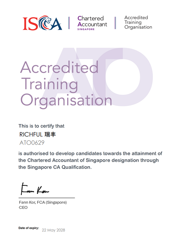 近期,RICHFUL瑞豐通過新加坡特許會(huì)計(jì)師協(xié)會(huì)(The Institute of Singapore Chartered Accountants, ISCA)審核,正式獲得“認(rèn)證培訓(xùn)雇主”(Accredited Training Organisation, ATO) 資格。該資質(zhì)表明RICHFUL瑞豐在會(huì)計(jì)人才培養(yǎng)體系及專業(yè)實(shí)踐機(jī)制上符合ISCA國際標(biāo)準(zhǔn),為企業(yè)深化國際化人才戰(zhàn)略奠定基礎(chǔ)。