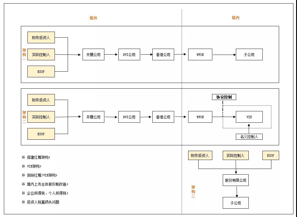 為實(shí)現(xiàn)境外上市,企業(yè)會(huì)面臨將公司從純內(nèi)資變?yōu)榧t籌架構(gòu)或VIE的情況,問題通常包括: