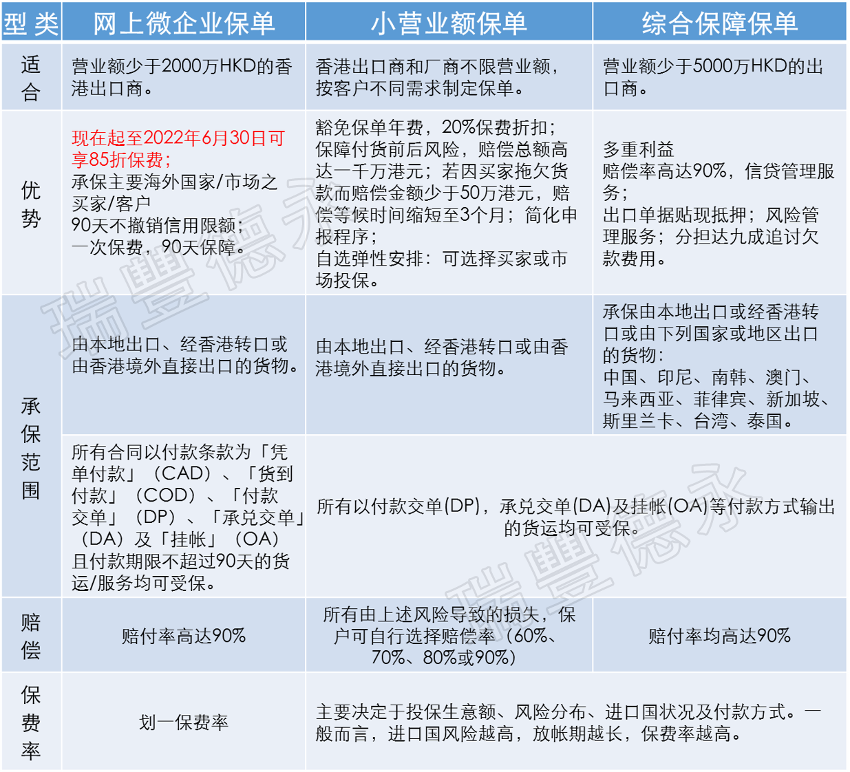 在全球此經(jīng)濟大背景下,涉及以上出口相關(guān)業(yè)務(wù)的您,應(yīng)與專業(yè)人士及時了解出口信用保險,建議盡早配置,以規(guī)避風(fēng)險、減少損失。此外,瑞豐德永在此特意提醒您,我們可為客戶提供「免費信用評估」服務(wù)(信用額度是香港信保局在指定期內(nèi)就該買家/客戶可能承擔(dān)的最高損失數(shù)額),為您獲取香港出口信用保險局出具的信用評估報告。