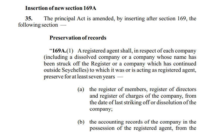 第 175 條修正案強制公司保留其在塞舌爾的財務(wù)記錄,并允許 FSA 檢查。