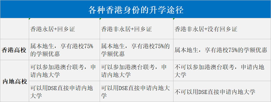 不管是永居還是非永居,關鍵點在于”回鄉(xiāng)證"。有回鄉(xiāng)證,就可以DSE和華僑生聯(lián)考的形式入讀內地大學。無論是永居還非永居,只要有回鄉(xiāng)證就可以。無論有沒有回鄉(xiāng)證,只要有香港身份都屬于本地生,可以享受75%的學額優(yōu)惠。不過,無論是那種情況,要想DSE考試優(yōu)勢最大化,都需要持有香港身份。