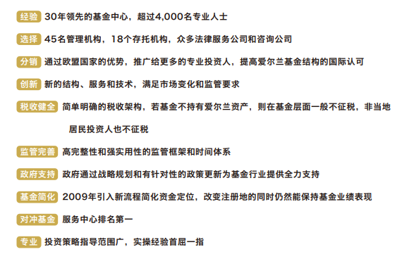 目前,許多中國資產(chǎn)管理人在愛爾蘭進(jìn)行各樣資產(chǎn)管理和資金相關(guān)服務(wù),例如,嘉實基金管理公司(Har-vest Fund Management)、南方基金管理公司(China Southern Asset Management)和廣發(fā)基金管理公司(GF Fund Management)等。愛爾蘭開放、透明和管理良好的投資環(huán)境,極其重視投資者保障,有效的稅收架構(gòu)以及充滿活力及創(chuàng)意的商業(yè)文化,吸引著國際基金發(fā)起人前往注冊。