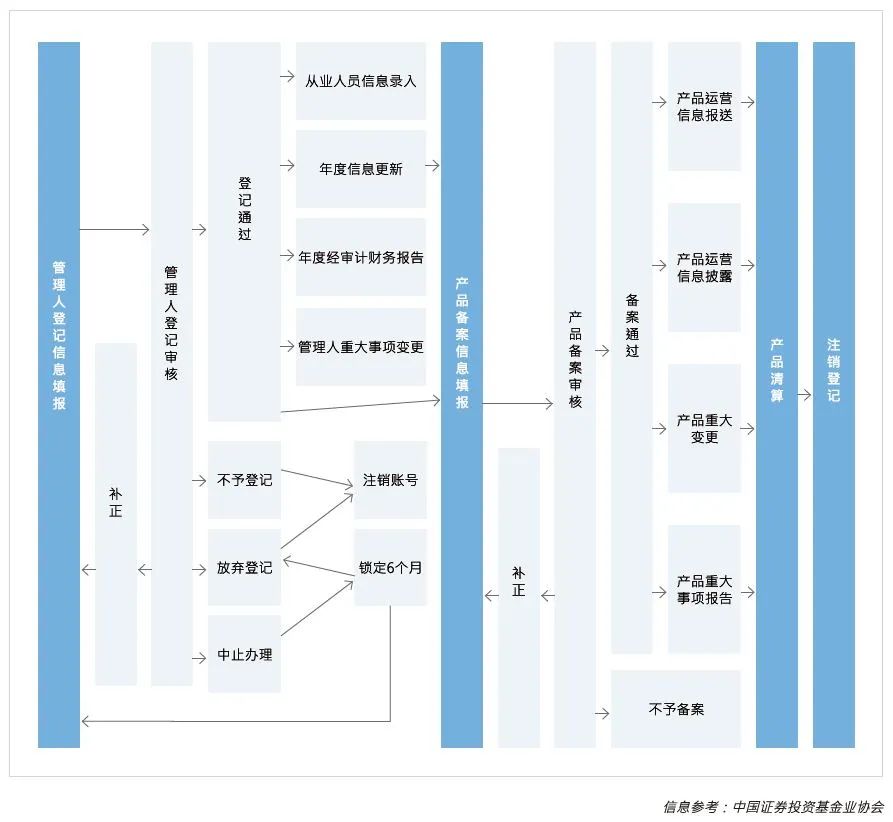 私募基金管理人需通過基金業(yè)協(xié)會的資產(chǎn)管理業(yè)務綜合報送平臺 (https://ambers.amac.org.cn) 進行基金備案,私募基金管理人及私募基金產(chǎn)品登記備案流程如下: