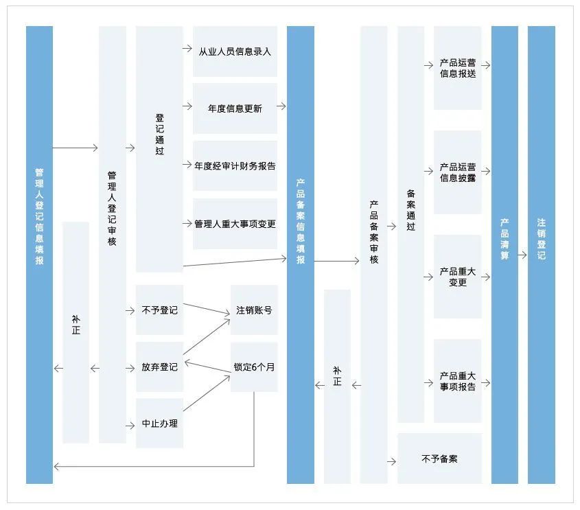 中基協(xié)應(yīng)當(dāng)在私募基金備案材料齊備后的20個工作日內(nèi),通過網(wǎng)站公告私募基金名單及其基本情況的方式,為私募基金辦結(jié)備案手續(xù)。私募基金管理人需通過中基協(xié)的資產(chǎn)管理業(yè)務(wù)綜合報送平臺進(jìn)行基金備案,私募基金管理人及私募基金產(chǎn)品登記備案流程如下: