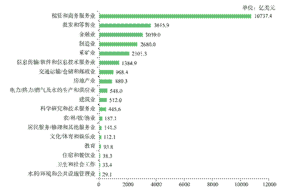 2022年,中國對外直接投資涵蓋了國民經濟的18個行業(yè)大類,其中流向租賃和商務服務、制造、金融、批發(fā)零售、采礦、交通運輸等領域的投資均超過百億美元。