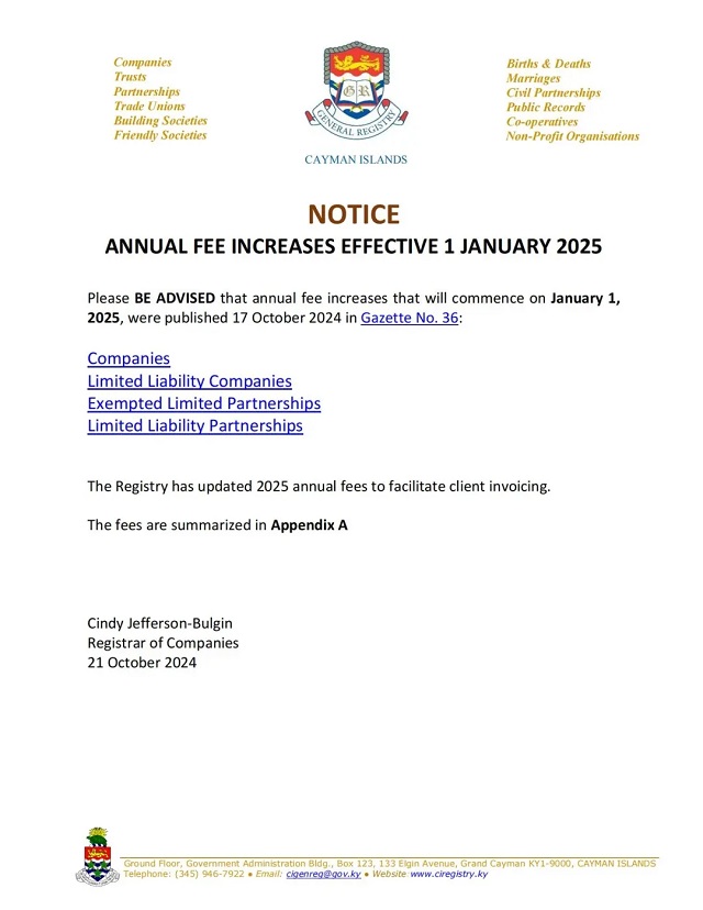 根據(jù)開(kāi)曼群島金融服務(wù)部于2024年10月21日正式發(fā)布的公告,隨著《公司法》(2024年附表5 修正案),《有限責(zé)任公司(費(fèi)用)》(2024年修正案),《豁免有限合伙企業(yè)(第2號(hào))實(shí)施細(xì)則》(2024年修正案),《有限責(zé)任合伙企業(yè)(費(fèi)用)實(shí)施細(xì)則》(2024年修正案) 等一系列修正案在政府憲報(bào)刊登,公司、有限責(zé)任公司、豁免有限合伙企業(yè)和有限責(zé)任合伙企業(yè)的年費(fèi)變更將于2025年1月1日正式生效。