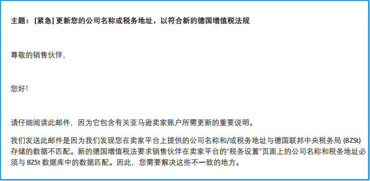 首先是稅務合規(guī)方面,您需要符合德國增值稅法規(guī)要求,除了確保VAT有效性之外。根據(jù)德國稅局要求,您還需要確保您在賣家平臺的地址和稅局的一致性。最近,有很多德國站點的賣家,收到了亞馬遜發(fā)出《[緊急]更新您的公司名稱或稅務地址,以符合新的德國增值稅法規(guī)》的業(yè)績通知,要求賣家對VAT證書上面的公司名稱/地址與亞馬遜賣家平臺的信息保持一致。
