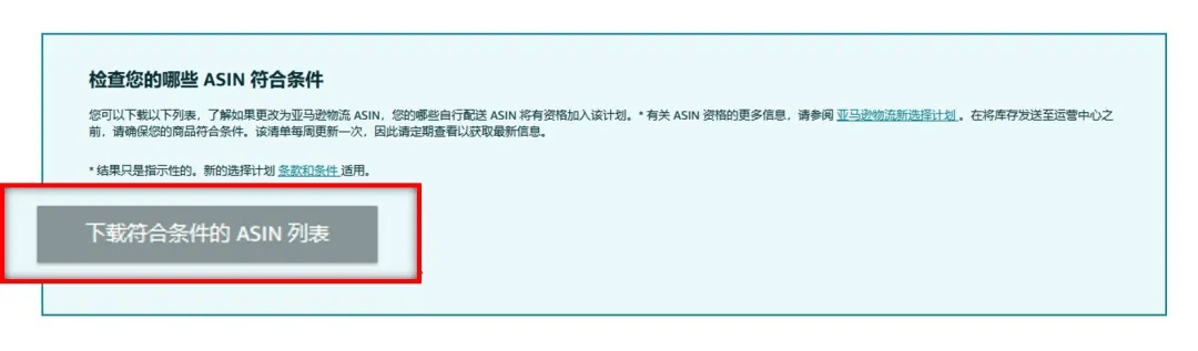 您可以在該計(jì)劃的活動頁中,點(diǎn)擊“下載符合要求的ASIN列表”按鈕,下載您目前在售的商品中符合該計(jì)劃的要求的ASIN清單。當(dāng)您注冊加入該計(jì)劃后,將這些ASIN轉(zhuǎn)化為使用FBA銷售并發(fā)送入庫,即可享受該計(jì)劃的優(yōu)惠福利。