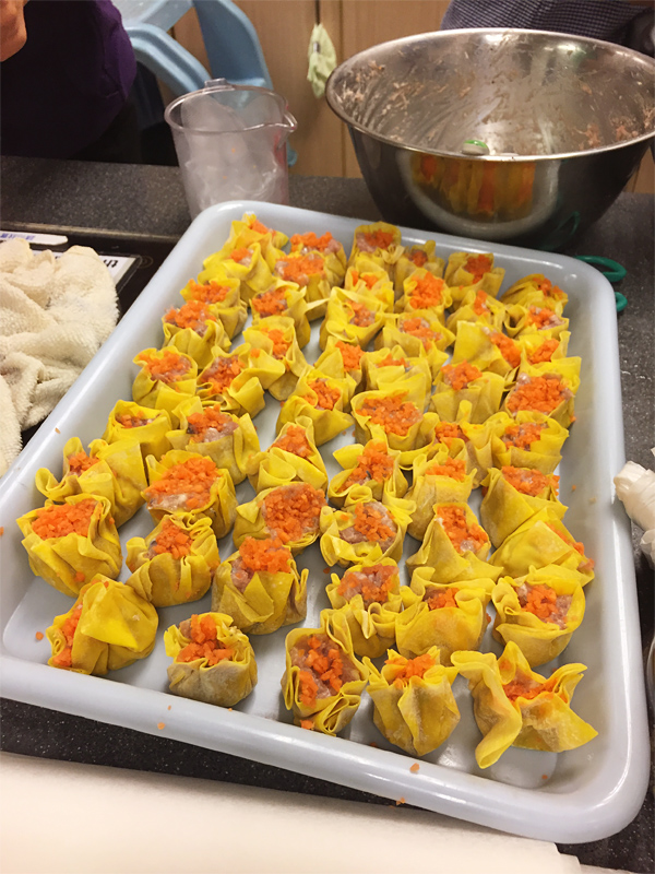 瑞豐義工團(tuán)都馬上動手,聽從導(dǎo)師指示分工,先包燒賣和臘腸卷。