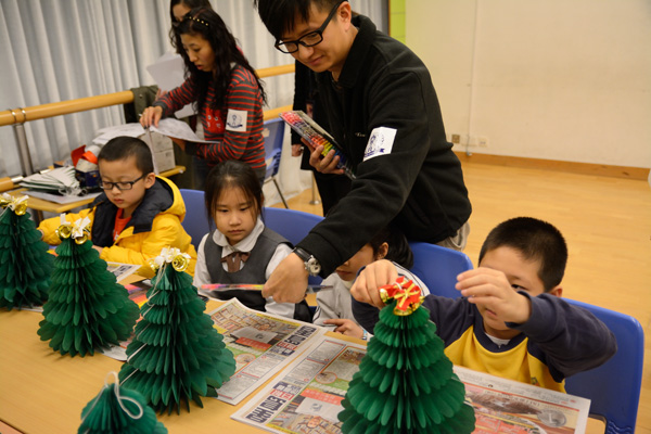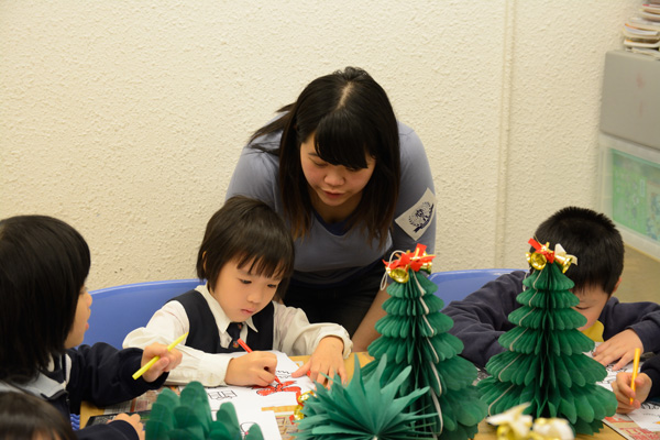 我們教小朋友制作、剪裁并鼓勵小朋友自己發(fā)揮創(chuàng)意設(shè)計圣誕樹的造型,大家坐在一起動手制作創(chuàng)意圣誕樹,不時傳出的談笑聲讓整個課室的氣氛非常溫馨。